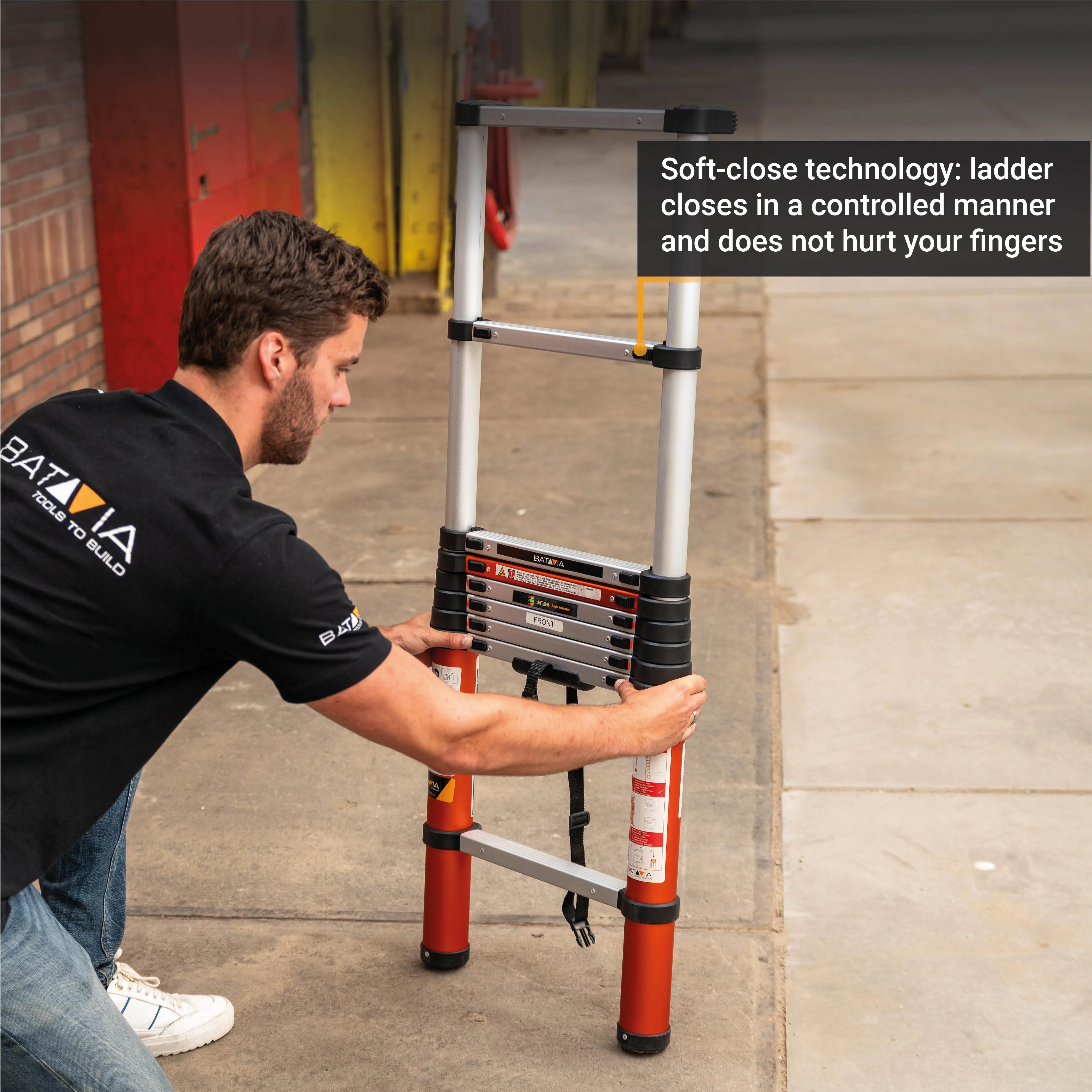 Unlike standard telescopic ladders, the Giraffe Air features patented air buffer technology that controls how the ladder collapses. Each rung descends slowly and steadily—preventing injuries and offering peace of mind when packing it away.